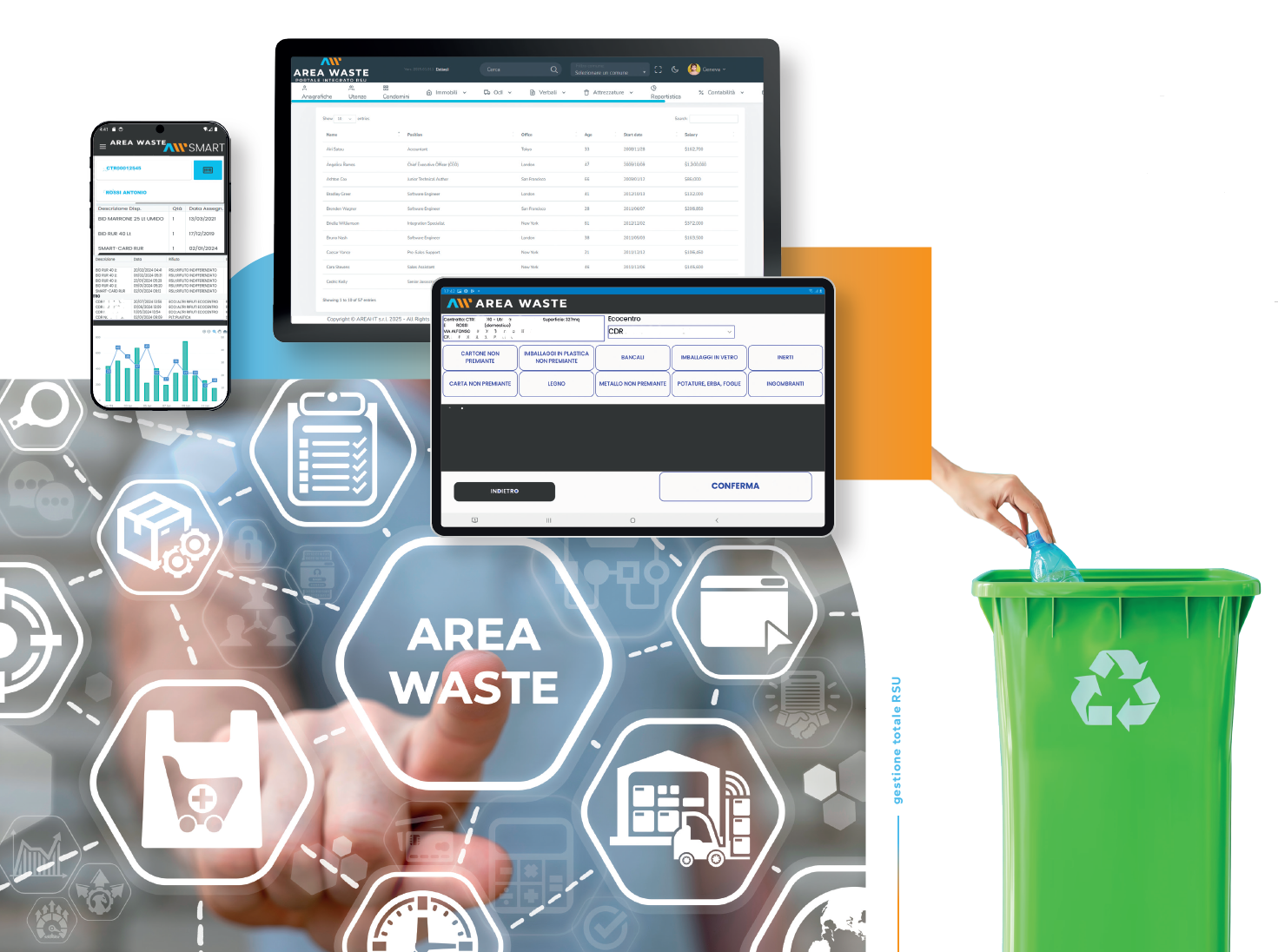 Area Waste è il portale che integra sistemi collaudati da anni nel ciclo della gestione dei rifiuti solidi urbani, completamente riscritto, nella versione 2025 include elementi di IA, attivabile in diversi moduli rispondente alle esigenze dei clienti